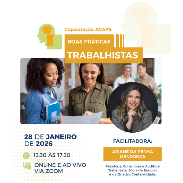 Por isso, a Acaps preparou a capacitação Boas Práticas Trabalhistas, que segue com as inscrições abertas. Agendado para o dia 28 de janeiro, o curso on-line terá como facilitadora a consultora e auditora trabalhista Ariane Mendonça, contribuindo para atualização de conhecimentos sobre admissão, jornada, folha, férias, desligamento e muito mais.