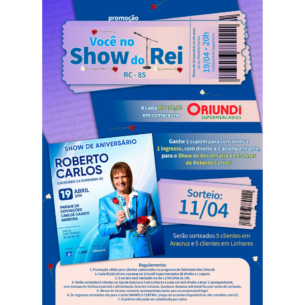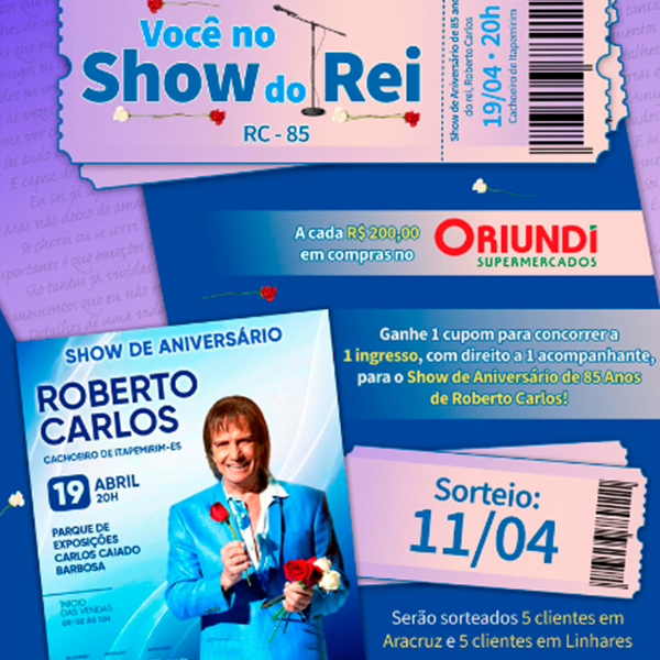 O rei Roberto Carlos completará 85 anos e fará um show comemorativo em Cachoeiro de Itapemirim, no dia 19 de abril. Para celebrar esse momento especial e presentear clientes que são fãs do artista, o Oriundi Supermercados, o lugar de grandes promoções, está sorteando ingressos para o show.